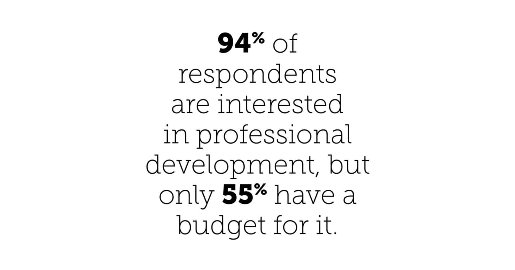 The survey also showed that the vast majority of survey respondents (91%) are interested in professional development opportunities. Communications (66%), marketing (64%), and the use of data to drive decision making (60%) are top areas of interest in skill development among respondents. However, although 91% are interested in professional development, only 59% have a budget allocated for it.