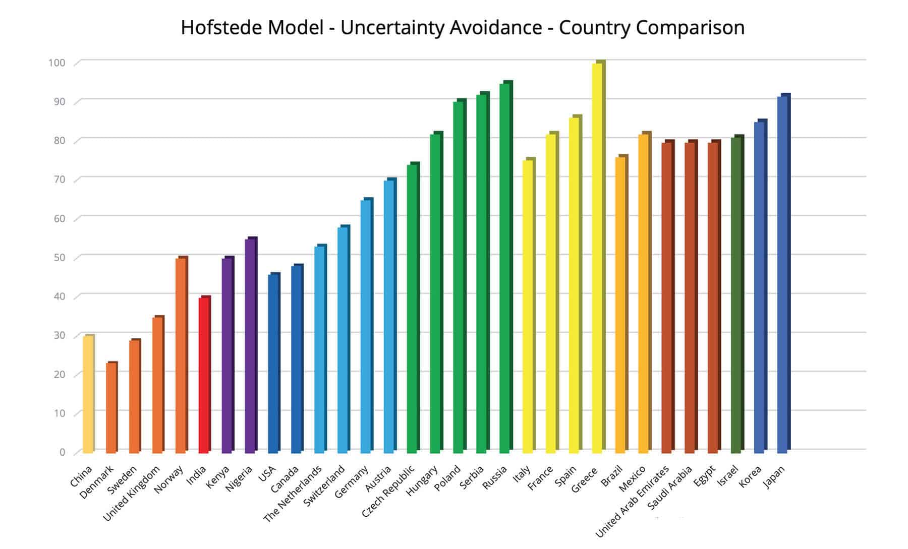 “The dimension Uncertainty Avoidance has to do with the way that a society deals with the fact that the future can never be known: should we try to control the future or just let it happen? This ambiguity brings with it anxiety and difffferent cultures have learnt to deal with this anxiety in difffferent ways. The extent to which the members of a culture feel threatened by ambiguous or unknown situations and have created beliefs and institutions that try to avoid these is reflflected in the score on Uncertainty Avoidance.” (Hofstede Insights, 2019).