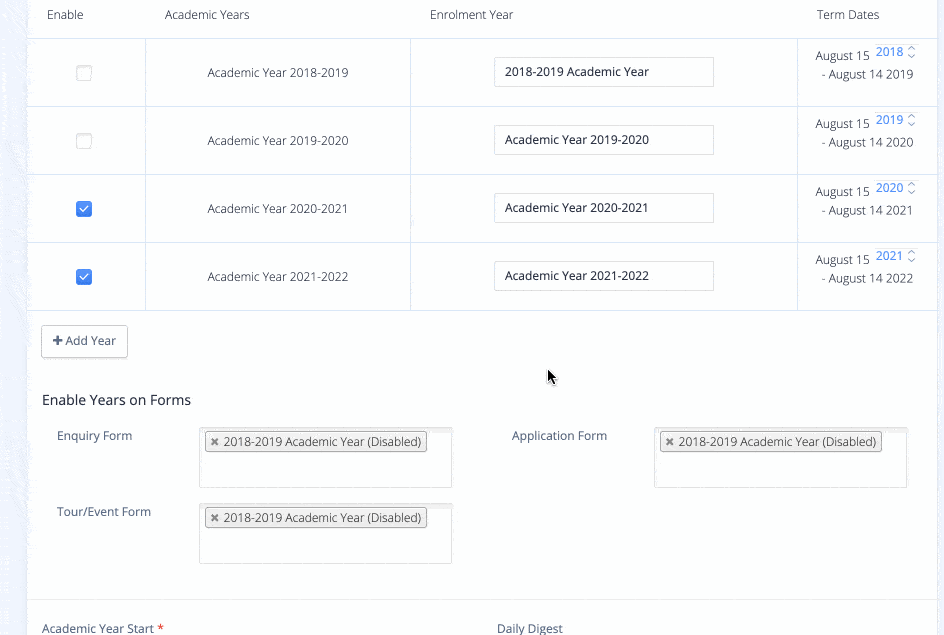OpenApply has released the ability to enable academic years on individual forms. Previously, if an academic year was enabled, by default it was enabled on all forms. Now, you can specify which academic years are enabled on the Enquiry, Application and the Tour/Event forms, individually.