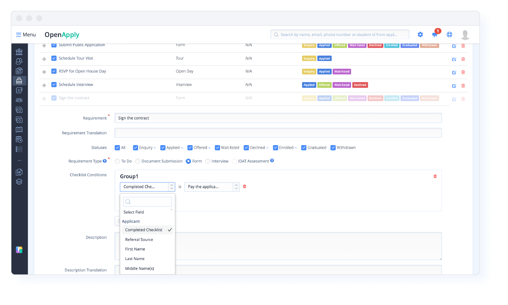 Building upon the existing checklist feature, it is now possible to apply conditional logic, whereby schools can mandate the completion of other checklists as a prerequisite before a particular checklist appears. This adds a sequencing layer to the structured admissions process, streamlining the workflow and ensuring that applicants progress through the necessary steps in a logical order. It also helps with reducing gaps and the risk of errors, and guarantees that each applicant has met the required criteria before advancing to the next stage. Additionally, schools can now set status levels as conditional logic to checklists. This means that applicants will only see certain checklist items once they have reached a specific status level.