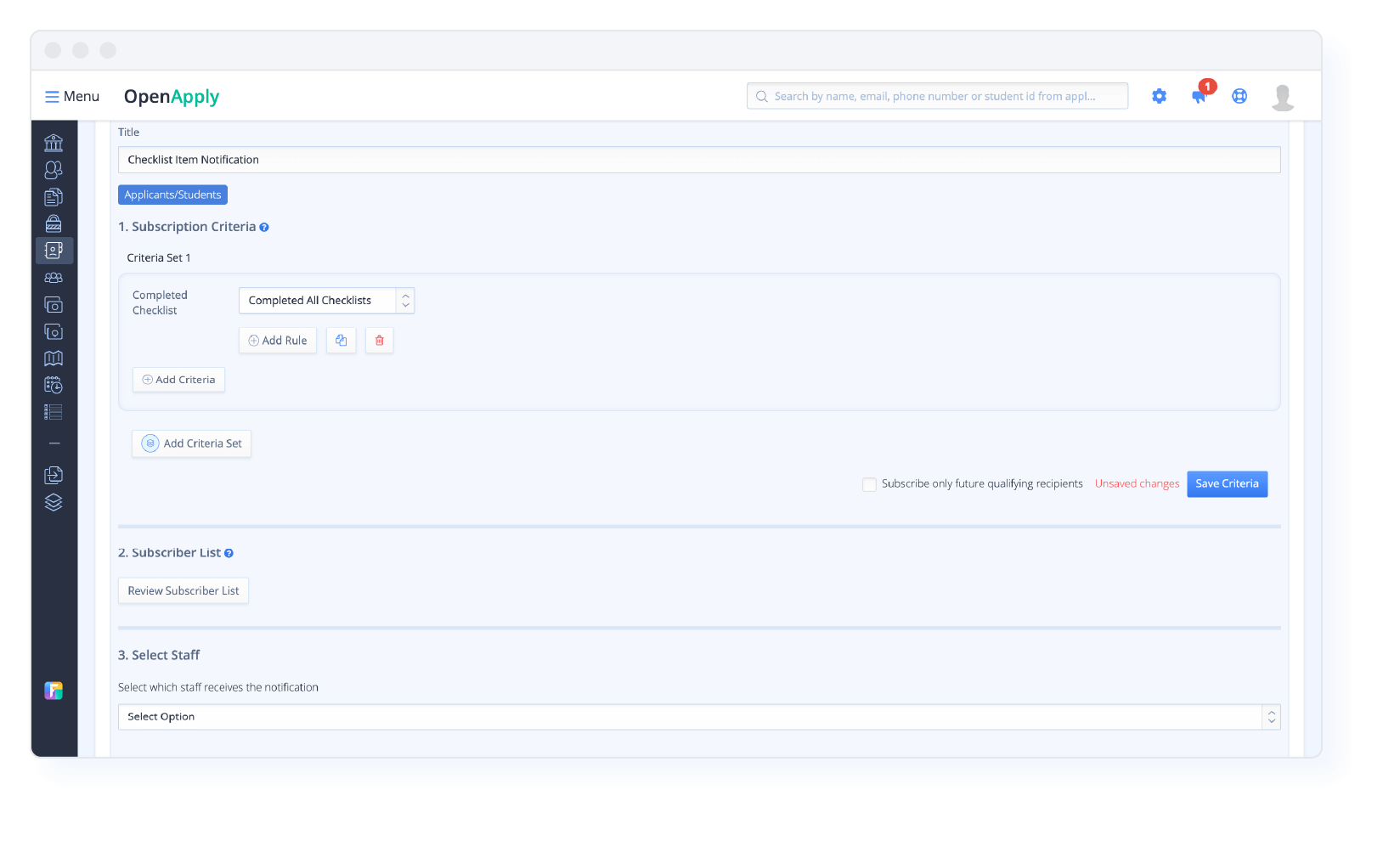 Enhancing communication efficiency through an added layer of automation, new subscription criteria can now be set for email campaigns on the OpenApply CRM (Pro Bundle) when an applicant has completed all of their checklist items. Automating the email campaign subscription process based on checklist completion ensures that communication is targeted and timely, and allows schools to send relevant information or follow-up messages to applicants precisely when they have fulfilled all the requirements in a checklist.