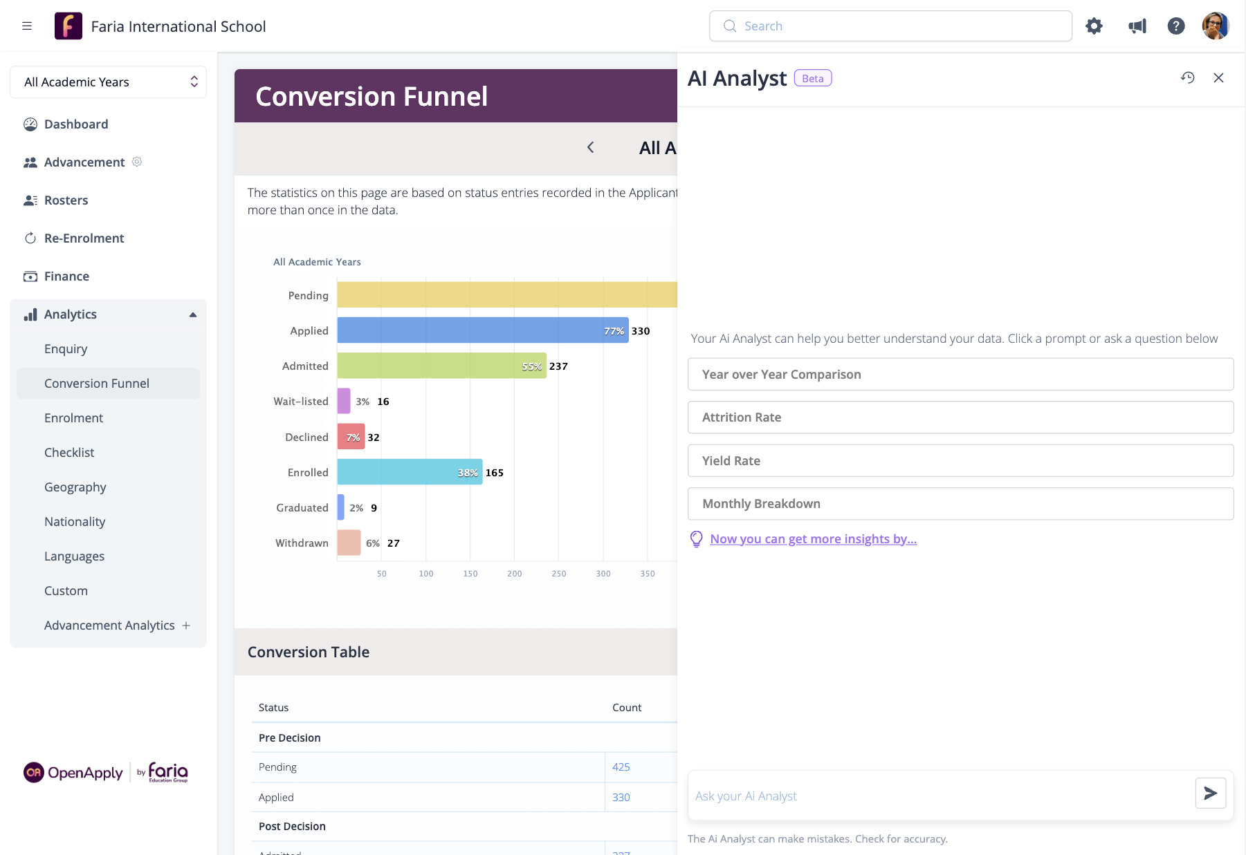 These enhancements give schools instant, accurate answers to complex questions, resulting in less time digging through data and more time acting on it. Enjoy a quicker and smarter way to surface key trends, patterns, and insights, whether you’re planning a strategy, reporting to leadership, or adjusting admissions tactics mid-season.