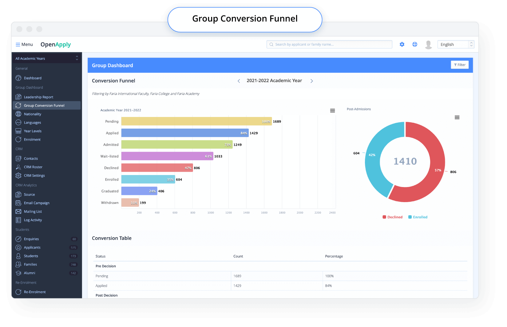 The Group Dashboard is an advanced module that provides easy access to admissions and marketing data across a number of OpenApply accounts for groups of schools. It provides immediate access to real-time, consolidated data from the group's admissions funnel, resulting in significant time saved for all stakeholders involved.