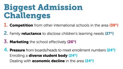 Competition dominates the landscape. As in 2015, competition from other international schools is the number one challenge (39%). Following behind were a family’s reluctance to disclose children’s learning needs (27%) and marketing the school effectively (26%). Coming in at 24% each were pressure to meet enrollment numbers, enrolling a diverse student body, and dealing with local economic decline.